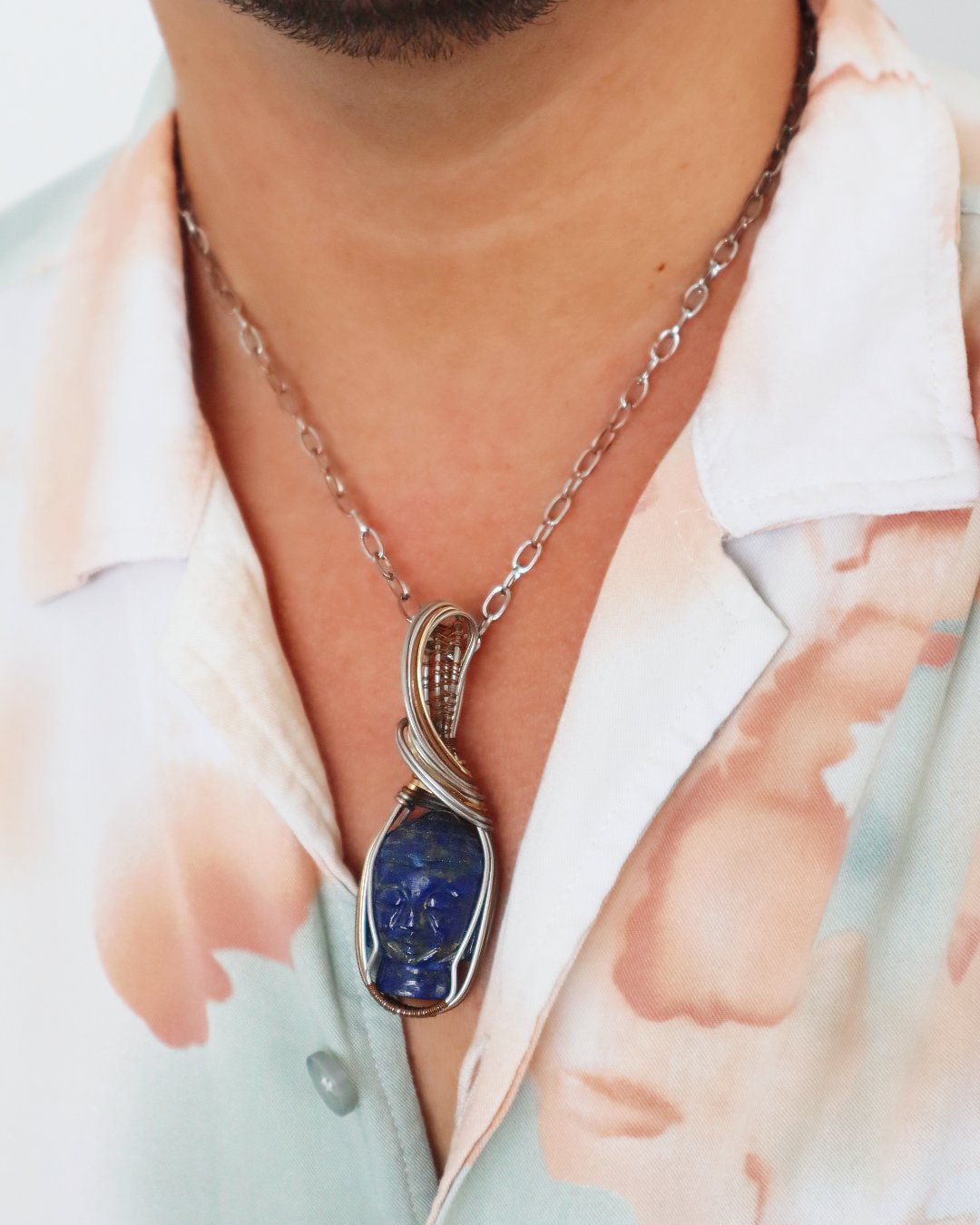 A unique necklace, crafted using wire wrapping techniques and made with love and respect. The centerpiece is a lapis lazuli Buddha. It features three types of wire: gold-filled (12/20), stainless steel, and copper. A powerful piece, made with truly durable elements.