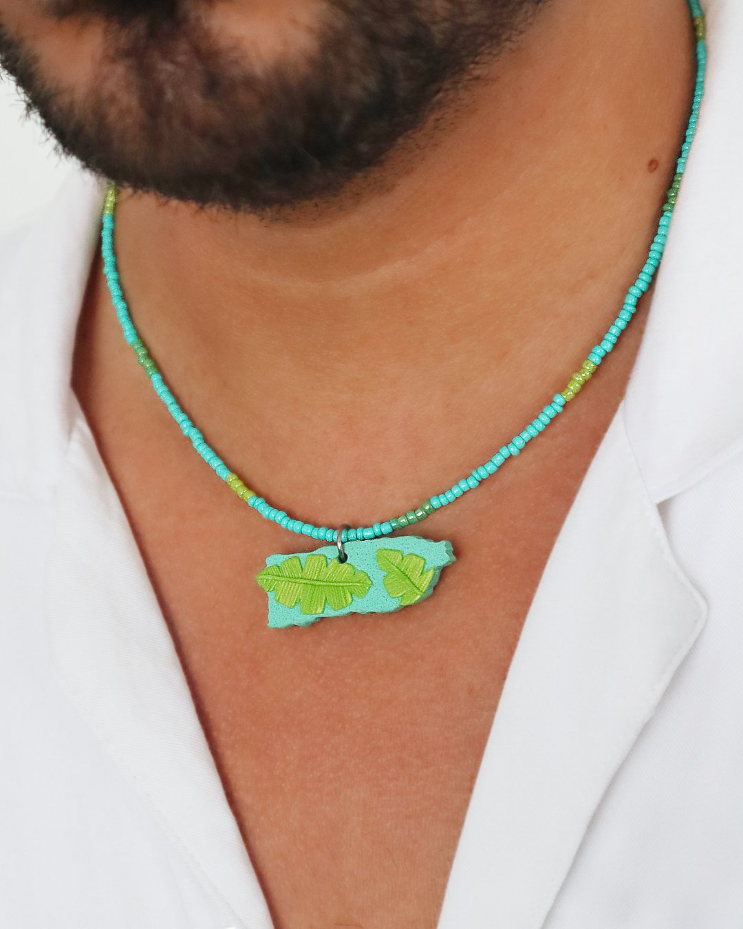 Simple necklace with seed beads. You can wear it as a choker or a regular length. The centerpiece is a polymer clay representation of the Puerto Rican archipelago.